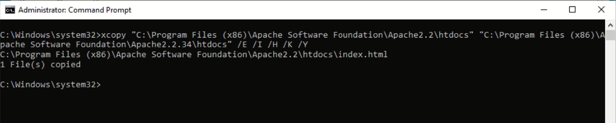xcopy "C:\Program Files (x86)\Apache Software Foundation\Apache2.2\htdocs" "C:\Program Files (x86)\Apache Software Foundation\Apache2.2.34\htdocs" /E /I /H /K /Y