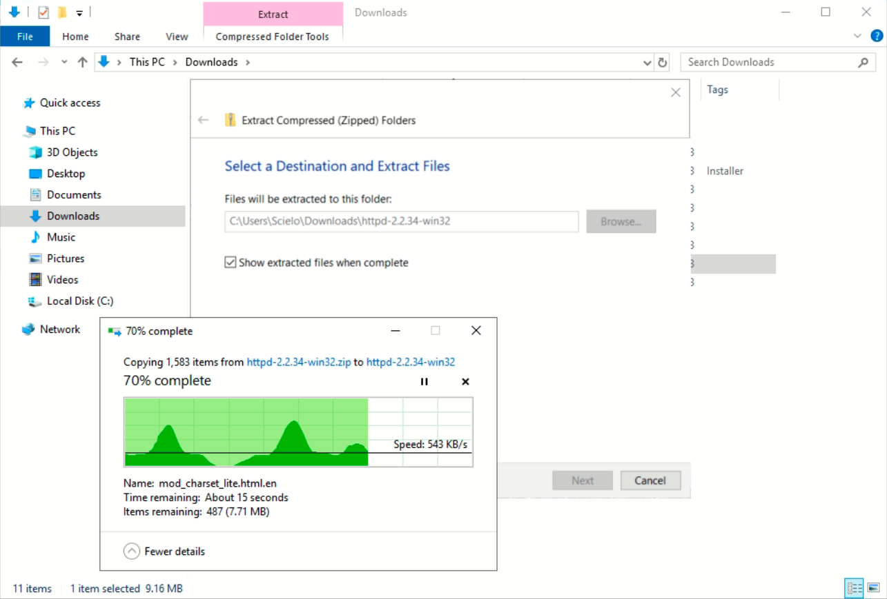O primeiro passo foi descompactar o download do Apache 2.2.34 (Win32 VC10) realizado na sessão de pré requisitos.