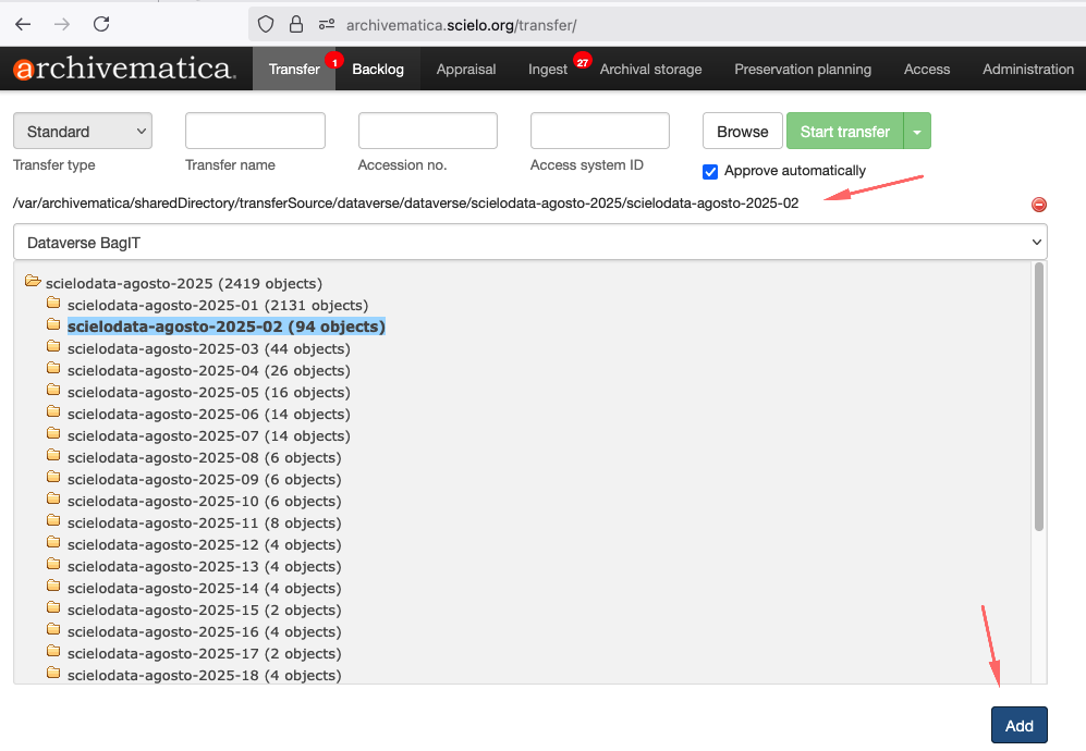 - Procurar : O botão Procurar alterna para abrir o navegador de transferência. Isso permite que os usuários visualizem e naveguem pelos locais configurados da fonte de transferência. Para obter mais informações sobre como configurar locais de origem de transferência que o Archivematica pode acessar, consulte o Manual do administrador - Serviço de armazenamento . Selecionar um diretório e clicar em Adicionar adiciona o diretório de materiais à transferência.