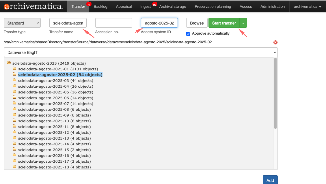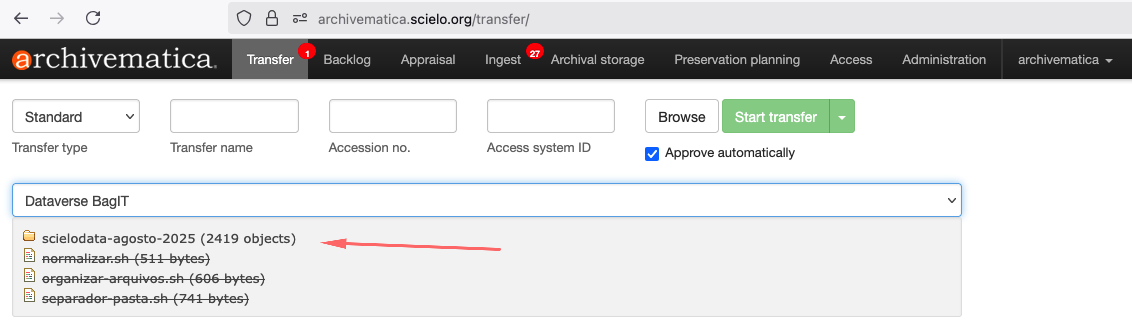 - Aprovar automaticamente : se esta caixa estiver desmarcada, o Archivematica fará uma pausa no primeiro micros serviço, Aprovar transferência , e você terá a chance de confirmar que sua transferência foi configurada corretamente. Se a caixa estiver marcada, o Archivematica não fará uma pausa nesta etapa.