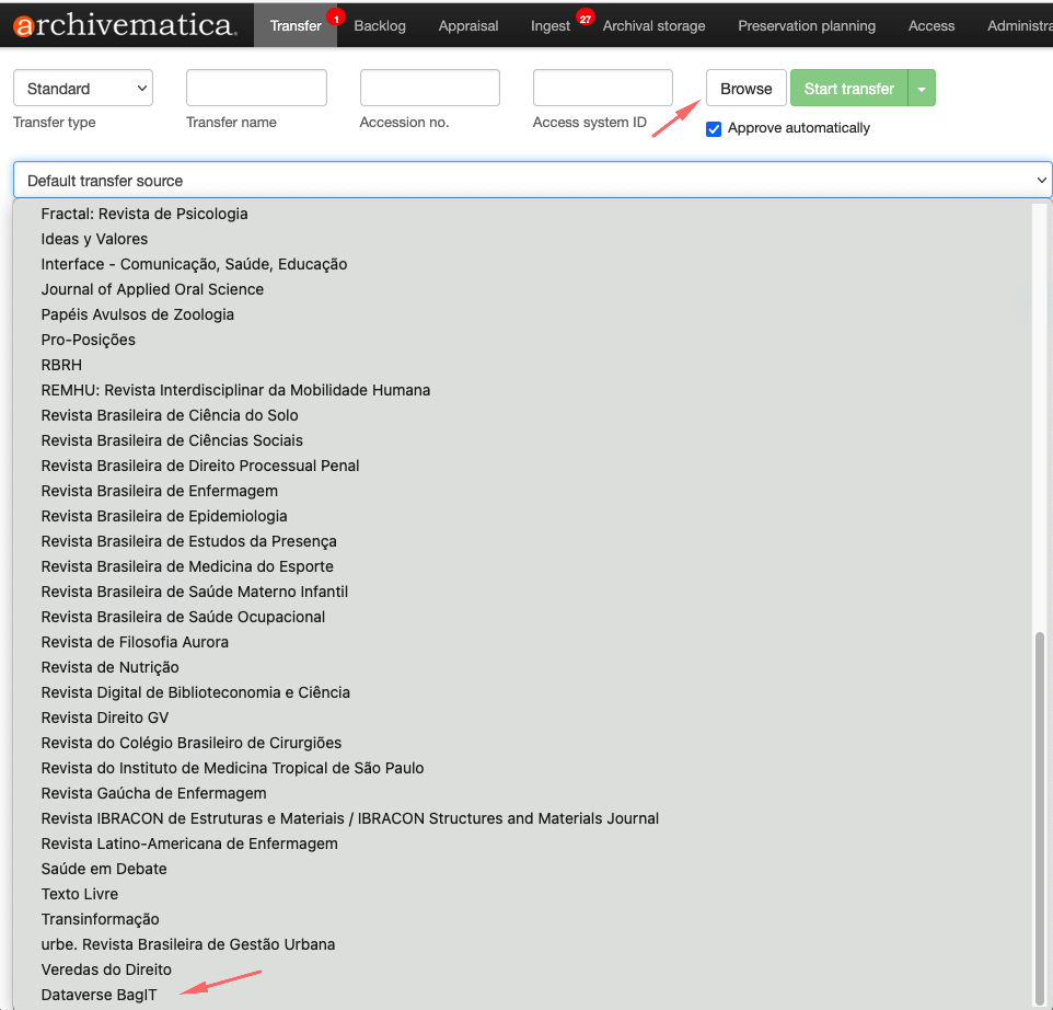 A guia Transferência é o local onde muitos usuários iniciam o processo de transformar seus objetos digitais em Pacotes de Informações de Arquivamento (AIPs). Na guia Transferência, os usuários selecionam o material a ser preservado, nomeiam a transferência e iniciam o processo de transferência.